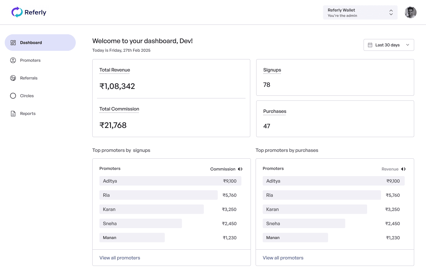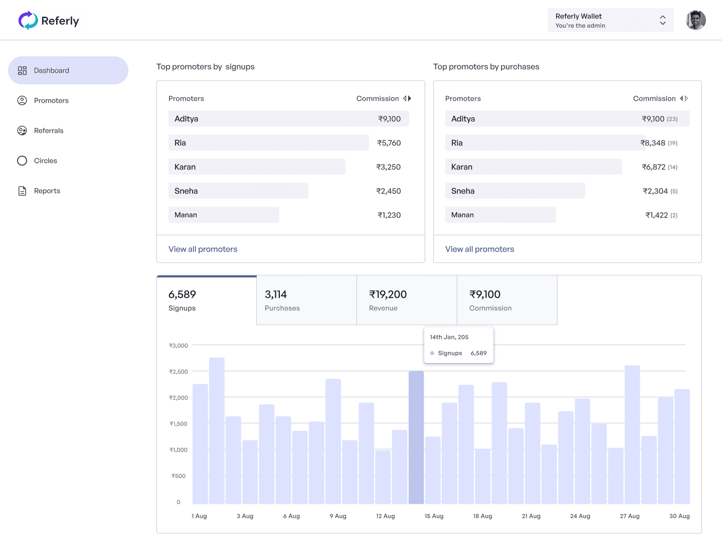 Get a complete overview of top performing promoters, revenue growth and commissions.