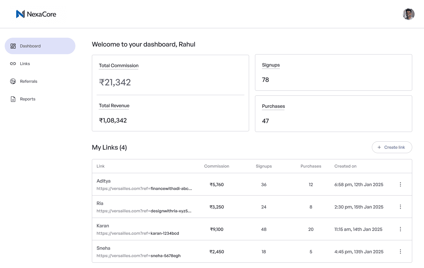 Get a comprehensive breakdown of your revenue milestones, commissions, and referral link activity.